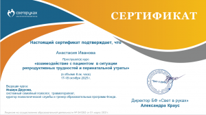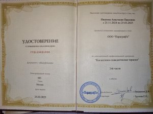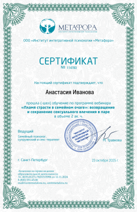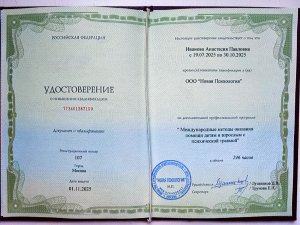 Получила в порядке профессиональной переподготовки профессию психолог-консультант. Практиковать начала сразу, в начале учебы. Продолжаю обучение.